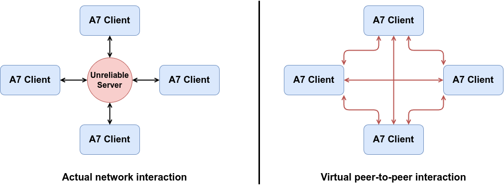 Even though we are using an unreliable server to connect our clients, consider it an abstraction of the unreliable network running under the transport layer. In reality, when sending messages from one client to another, you must consider the connection to be a peer-to-peer connection.